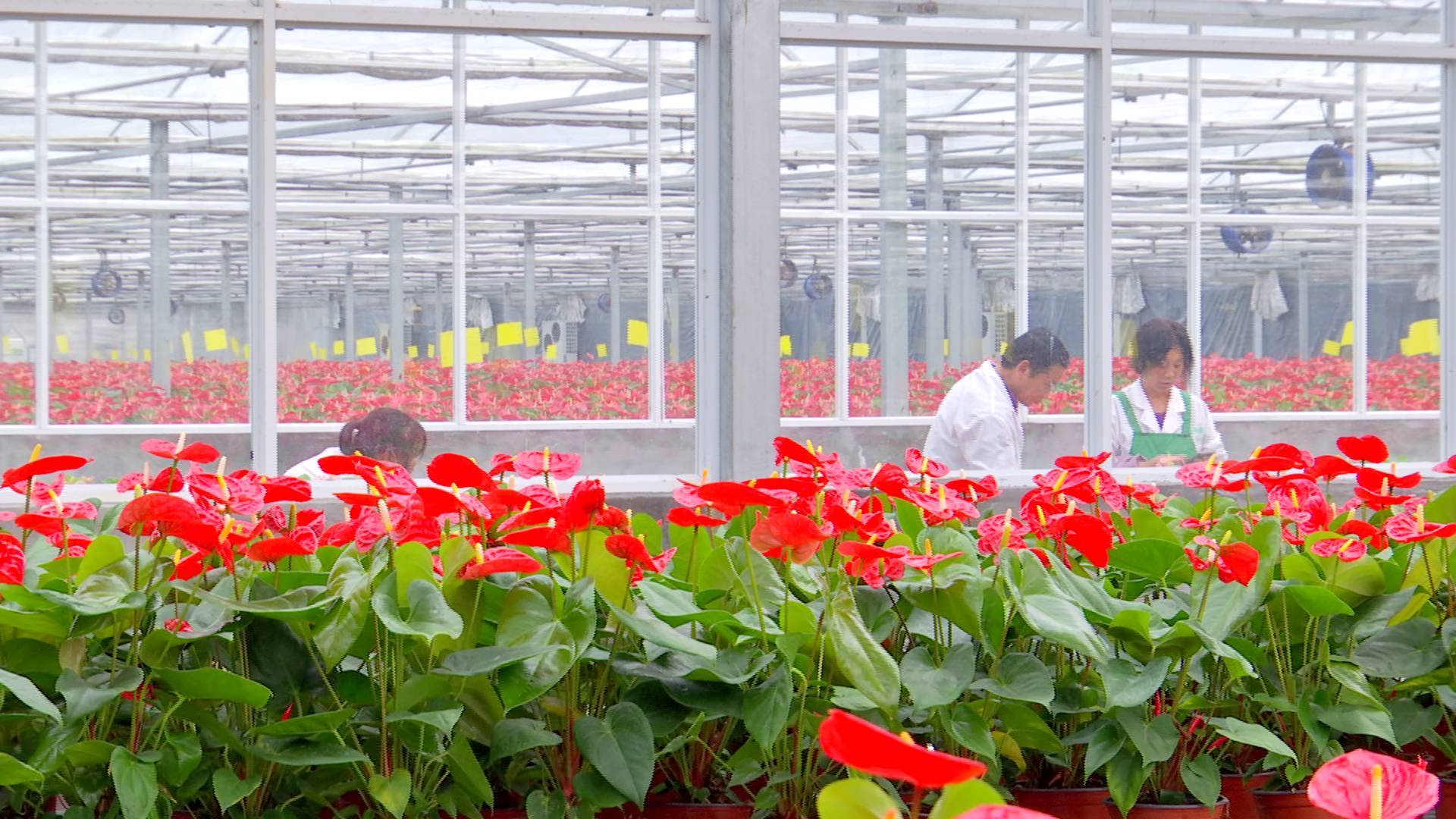 據了解,整個大棚配備了從國外引進的環控、溫控、水凈化、自動配肥施肥系統,全過程實現濕度、溫度、光照、營養液配方智能化控制。在現代技術的幫助下,紅掌的生長狀態、環境變化等信息都可以輕松獲取,一株株紅掌枝干茁壯、葉片蔥綠。每月四萬盆紅掌從這里“走”出,銷往長三角地區。“我是罡門村人,幾年前從部隊退役,想著做點實業。”周笙,這位“新農人”說道,“后來,我們選中了花卉項目,綜合考慮交通因素和各種政策支持,我們最終決定落戶在罡門村。” 高科技帶來高品質。從2017年投資以來,他們的紅掌產業越做越大,合作的經銷商也遍布周邊城市。周笙說:“后期,我們會提升紅掌的品質,使它株型更飽滿,顏色更艷麗。我們也在研究水培紅掌,準備擴建三期、四期項目,把花卉產業進一步越大。”