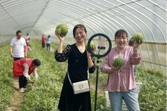 挑選、采摘、搬運(yùn)、裝車⋯⋯走進(jìn)西瓜大棚,綠油油的西瓜藤鋪滿大地,一個(gè)個(gè)圓滾滾的西瓜掩映其中,用手輕輕一敲就能聽見清脆的“咚咚”聲,大家忙著采摘,一派忙碌景象。婁東村黨總支書記、村委會(huì)主任祝竹手機(jī)響個(gè)不停,都是要貨的電話。祝竹說(shuō),當(dāng)天采摘的特小鳳西瓜,黃瓤多汁、甜脆鮮嫩、皮薄形美,頭茬瓜上市時(shí)間早,從5月中旬持續(xù)賣到9月上旬,每畝產(chǎn)量約四千公斤,除去人工、租金等成本,每畝純收益可達(dá)1.5萬(wàn)元以上,僅此一項(xiàng)增加村集體收入10多萬(wàn),還帶動(dòng)10多位低收入農(nóng)戶家門口就業(yè)。 “愛瓜的親們,這種迷你型特小鳳西瓜,每只三四斤,吃起來(lái)方便。” 在大棚采摘現(xiàn)場(chǎng),該村的網(wǎng)紅主播孫琴、洪霞手捧著西瓜在線上直播。孫琴輕輕叩開一只瓜,露出新鮮的黃瓤,咬上一口,汁水四溢,香甜可口。姜堰城區(qū)網(wǎng)友張芳看到畫面,駕車直奔田頭,買了4只瓜。“雖然5元錢一斤,但吃口超過(guò)了大瓜,我每年都來(lái)買。”張芳坦言。