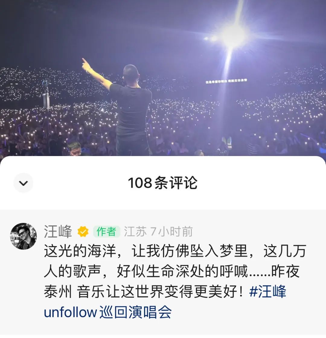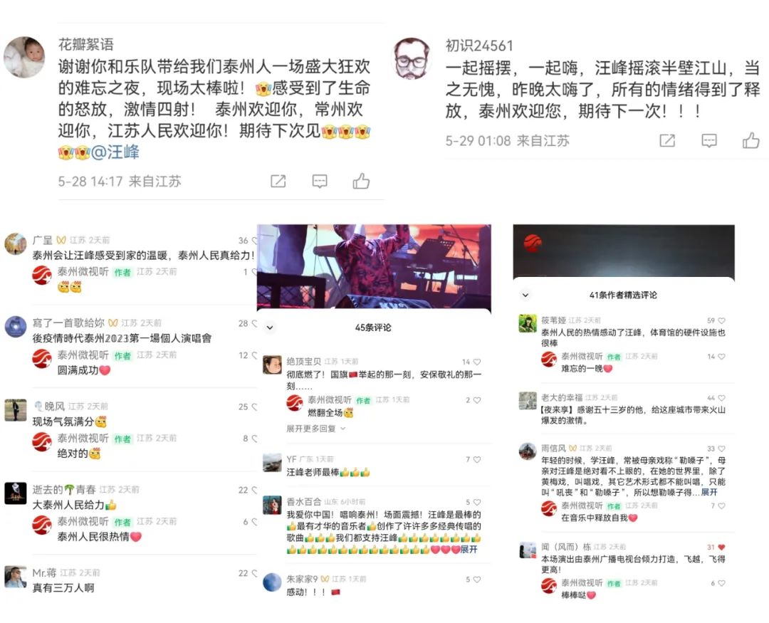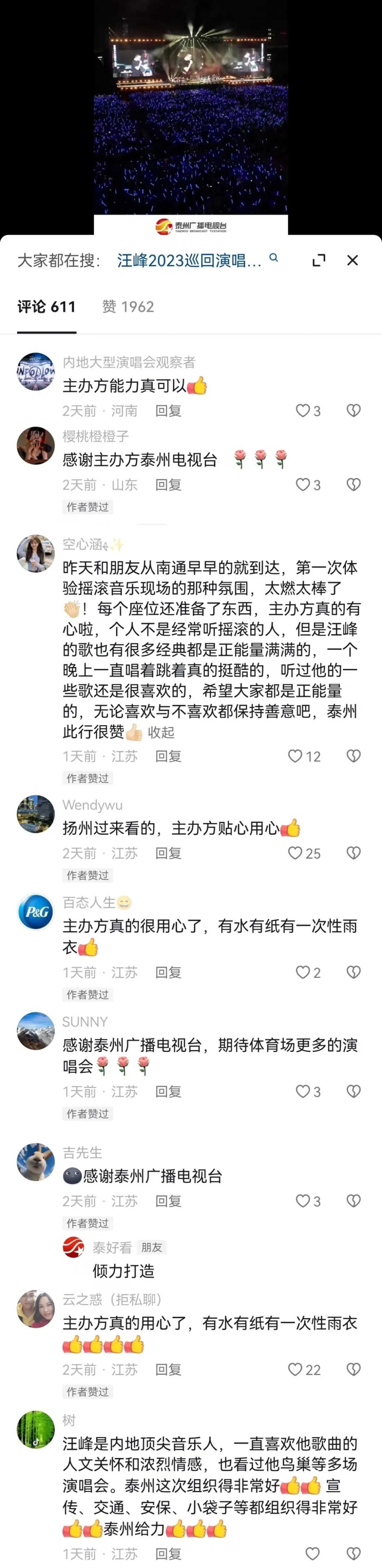5月27日 這一夜光影律動(dòng) 沉浸藍(lán)色海洋 這一夜點(diǎn)亮夢(mèng)想 共舞青春盛會(huì) 這一夜激情澎湃 唱響時(shí)代旋律 關(guān)于Ta的話題 一時(shí)間登上熱搜 Ta火了 『Ta是誰(shuí)』 Ta!是我們生活的這座城市 這是5月27日晚,2023汪峰「UNFOLLOW」巡回演唱會(huì)舞臺(tái)中央的精彩定格。巨大的“泰州泰州”,隨著汪峰的激情演繹,引發(fā)全場(chǎng)海嘯般的歡呼…… 因?yàn)樵詿釔?ài)。因?yàn)檎J(rèn)同,所以熱忱。 Ta,就是泰州。中國(guó)最具幸福感城市、全國(guó)文明城市三連冠……“強(qiáng)富美高新泰州”的美麗畫卷在這里再次完美鋪展。 Ta有全國(guó)最美的千垛菜花; Ta有全國(guó)最大的水上廟會(huì)溱潼會(huì)船; Ta還是梅郎故里、戲曲圣地; Ta還有聲名遠(yuǎn)播的“泰州早茶,早來(lái)泰州”; …… 這些年,梅藝節(jié)、會(huì)船節(jié)、菜花節(jié)……催生了泰州一個(gè)又一個(gè)“高光時(shí)刻”。 2022年的省運(yùn)會(huì),更是像一團(tuán)熊熊的火焰,點(diǎn)燃了泰州人民“一起向未來(lái)”的火熱激情。 繼省運(yùn)會(huì)后,一場(chǎng)大型活動(dòng)從醞釀、策劃、組織到實(shí)施,一步步走來(lái)。 就在5月27日,這場(chǎng)全民共赴的視聽(tīng)盛宴——2023汪峰「UNFOLLOW」巡回演唱會(huì)精彩亮相。 Ta, 在聚光燈下,再一次聲名遠(yuǎn)揚(yáng)。 ——汪峰眼中的泰州:泰州太美 順風(fēng)順?biāo)?/p> 汪峰他說(shuō) ——粉絲觀眾眼中的泰州:這里是個(gè)幸福感特別高的城市 我從上海來(lái)的,這是我第一次來(lái)到泰州。 感受到這里是個(gè)幸福感特別高的城市,人文氣息很足。 我來(lái)自長(zhǎng)沙。 泰州的早茶特別美味,最好吃的是魚湯面。泰州是個(gè)特別溫暖的城市,我也感受到了泰州人民特別包容。 我感受比較深的就是泰州的交警,很熱情地給我們提供了停車指南。