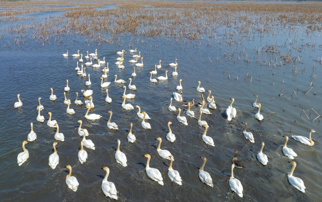 進入徐馬荒的深處,也就進入到各種鳥類棲息的片區。在茂密的蘆葦蕩叢中,各種鳥類忽高忽低、時隱時現地穿梭于河道兩邊的荒灘中。當記者不斷地被成群飛過的鳥兒驚到時,沈永干告訴記者,相對于后面的觀鳥地點——八公山,這里只是管中窺豹。
