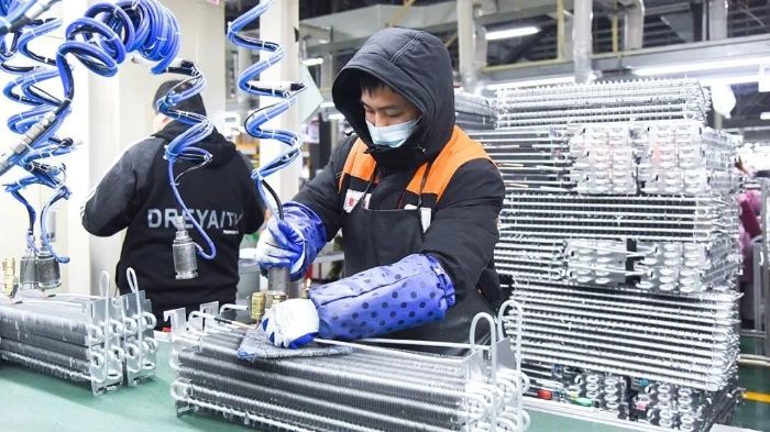 作為海陵智慧家電產業鏈的鏈主企業,2022年樂金電子實現工業開票銷售93億元,“鏈”起本地配套企業突破30家,產業鏈規模超150億元,其中17家已成為規上企業,涵蓋主控板、電機、壓塑機零部件等產品,產業鏈條完整。 蒸發器和冷凝器是空調、冰箱等制冷設備中的重要部件。位于海陵工業園區的泰州仕達利恩電子有限公司是一家韓國獨資企業,主要生產銷售片式元器件、光電子器件及冰箱零配件。步入生產車間,產品通過傳送帶送到每個工序,一條生產線近30名工作人員配合默契。“我們目前有13條生產線,年產蒸發器冷凝器500萬套。2022年,企業實現工業開票銷售4.89億元。”公司管理部科長樸成介紹。