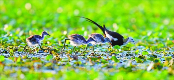 “鳥爸爸走在前面,身后是三只鳥寶寶,特別萌……”8月15日是首個全國生態日,鳥友王萬才再一次來到興化市烏巾蕩濕地公園,拍攝到水雉育雛的溫馨一幕。