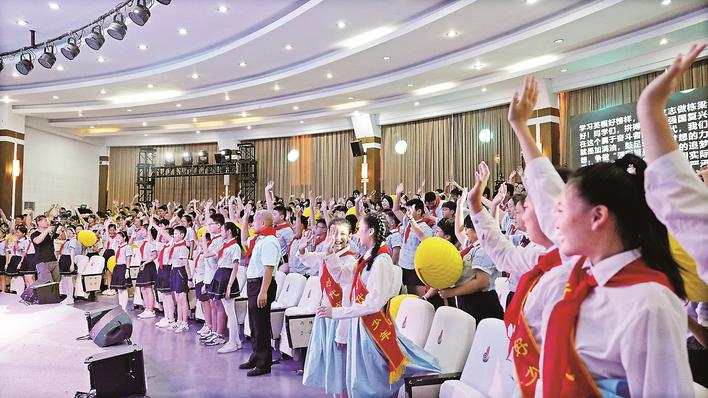 活動現場,全國農業農村勞動模范費琳琳帶領同學們走進第二課堂《織夢農場》,讓孩子們體驗汗水和勞動的收獲,展望現代化農業背景下,鄉村振興的美好前景。 新時代是追夢者的時代,也是廣大青少年成就夢想的時代。“我的夢想是成為人民解放軍,在人民需要的時候挺身而出;我的夢想是當一名語文老師,讓更多的孩子愛上閱讀,感受中華文化的獨特魅力;我的夢想是成為一名軍事科學家,為祖國研究導彈,讓祖國更加強大……”第三篇章《一封夢想的信箋》,孩子們紛紛暢談自己的夢想,立志從小學先鋒,長大做先鋒,努力成長為能夠擔當民族復興大任的時代新人。 “童心逐夢向未來,泰州少年心向黨……”在情景朗誦《少年心向黨》中,現場所有學生共同宣誓:泰州少年心向黨,諄諄教導永不忘;學習英模好榜樣,勤奮刻苦樹理想;砥礪品格講文明,全面發展圓夢想;泰州少年心向黨,從小立志做棟梁! |