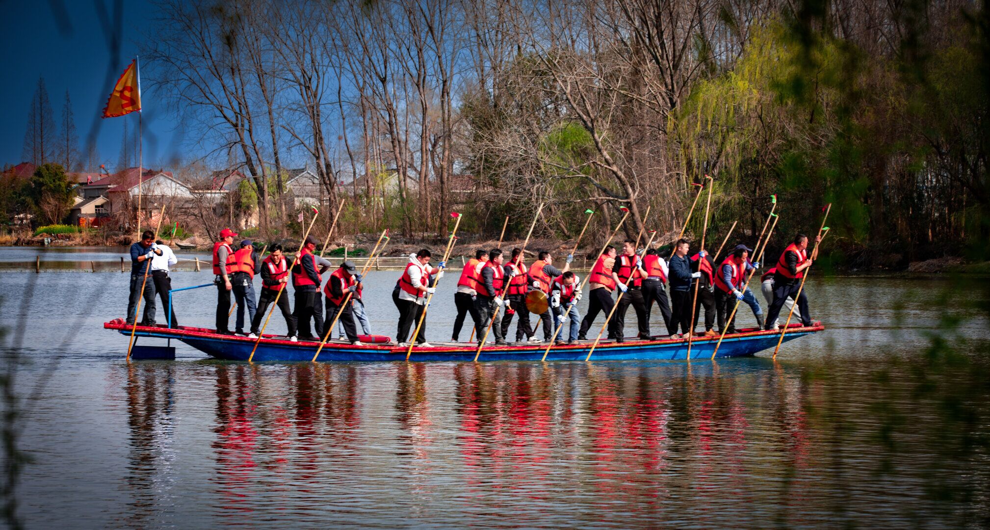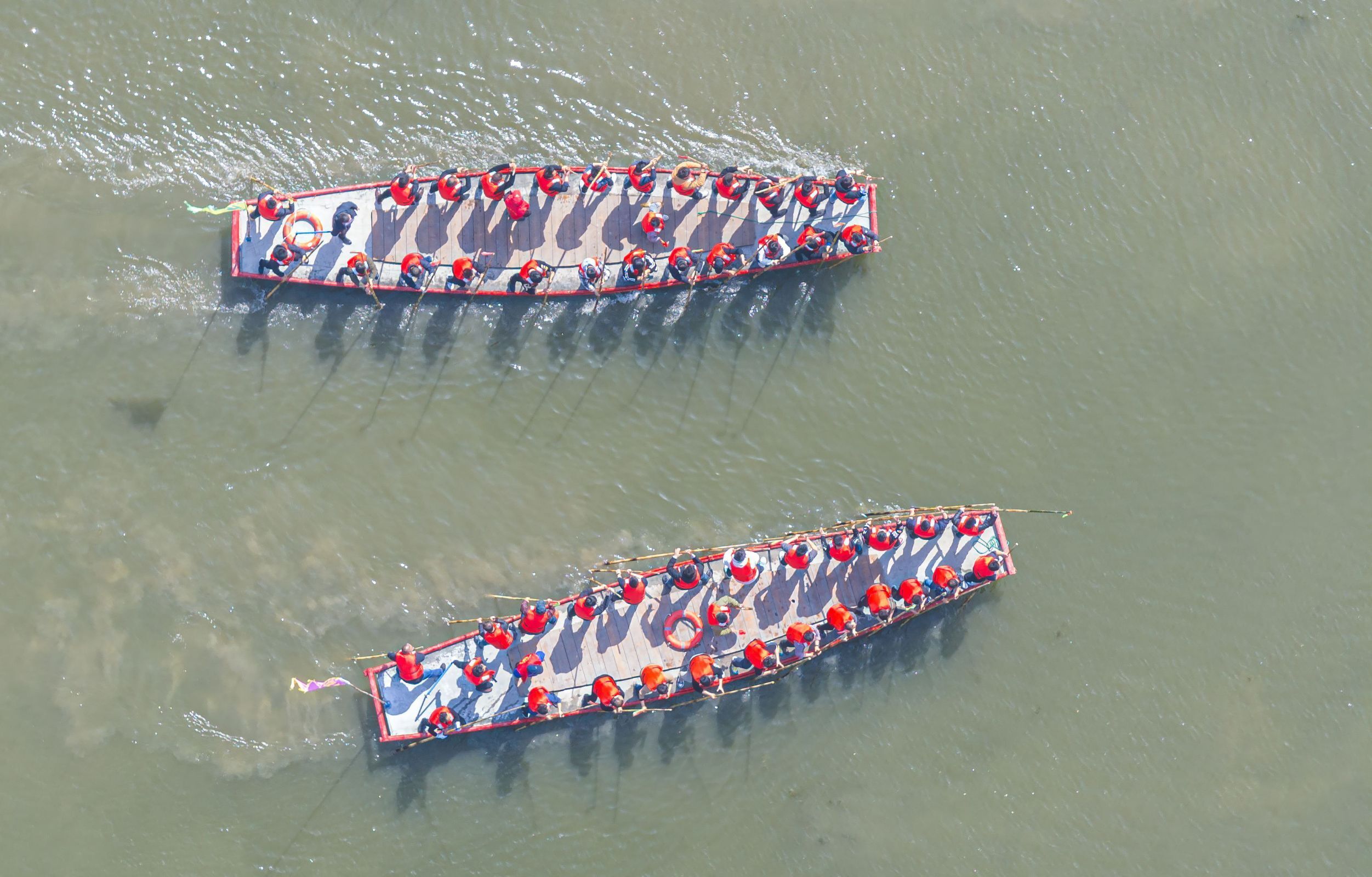 鑼聲洪亮、揚(yáng)篙激浪……這兩天,在溱潼鎮(zhèn)湖南村圩內(nèi)湖面上,來自姜堰各地的180多名青年篙手,練篙試水,逐浪溱湖,備戰(zhàn)首屆溱湖篙船大賽及會船節(jié)開幕式展演,演繹出有別往年的速度與激情。 據(jù)了解,今年姜堰區(qū)報名爭當(dāng)篙船大賽選手的年輕人很多,最終綜合考慮遴選了2600多人,年齡基本都在45歲以下,“這是今年溱潼會船節(jié)的一大看點(diǎn)。” 不過,在溱湖里掌篙并非易事,無論是制篙的工藝,還是撐篙的力度、節(jié)奏的把控,都需要豐富的經(jīng)驗。近年來,會船的“門檻”讓篙手慢慢剩下些“老把式”。如何帶動新鮮血液加入?今年,姜堰區(qū)將會船改為持續(xù)數(shù)月的競速賽事——首屆溱湖篙船大賽,讓原本的觀眾變?yōu)檫x手,吸引了一大批年輕人報名。