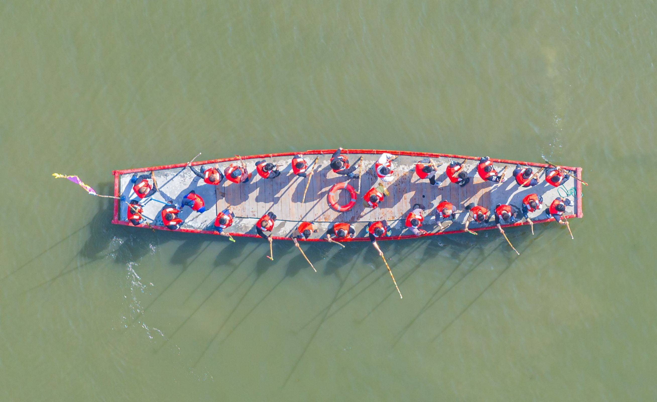 “篙要靠船而下,既不能下到船底,也不要離船過遠(yuǎn),防止篙子把人逼下水或?qū)е聛G篙現(xiàn)象……”記者登上羅塘街道的一條訓(xùn)練船,只見24名篙手分站兩邊,加上船尾舵手和船間揚(yáng)鑼手,共 26 人,船上71歲的教練田文奎正在指導(dǎo)教學(xué)。 “再來回練兩遍,熟能生巧!”田文奎說罷,35歲的陳浮嫻熟地敲起銅鑼,隨著鑼聲響起,篙手們揚(yáng)起篙來,動作整齊、擊水前行,鑼響篙落、步調(diào)一致。 陳浮說,她家住姜堰城區(qū),此前從未上過船,報名參賽后,利用休息時間操練,經(jīng)過教練手把手指教,半個月下來,已初步掌握了揚(yáng)鑼技巧。以后,她打算年年參加會船節(jié),強(qiáng)身健體的同時向游客展示家鄉(xiāng)會船文化的魅力。