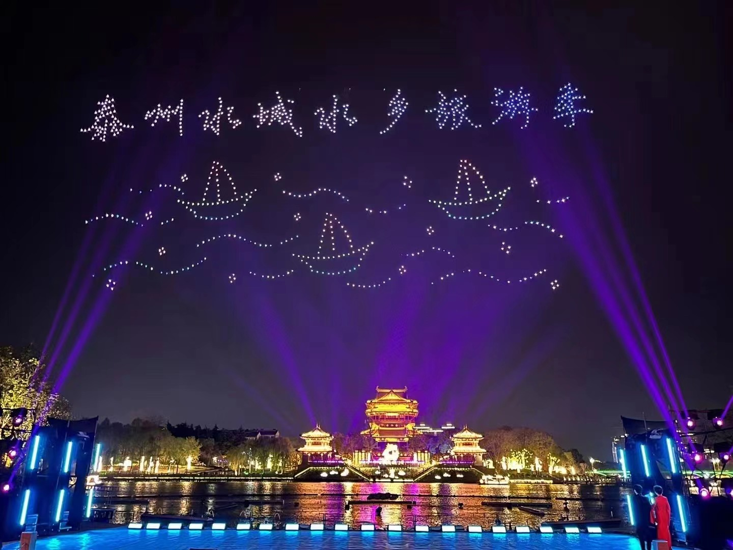 當(dāng)晚,800架無人機(jī)以天為幕、以城為景,在聲光電的絢爛襯托下閃耀登場(chǎng)。以天為幕,以城為景。“江淮第一樓”望海樓在夜色中被旋轉(zhuǎn)點(diǎn)亮。“她”初建于南宋,多少人曾經(jīng)登上它眺望海天一色,如今大海褪去,但望海之情猶在,依舊在泰州人的心中流光溢彩。