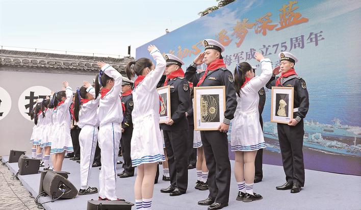 因“泰州”這個共同的名字,一艘艦與一座城緊緊相連。“我是中國人民解放軍軍人,我宣誓:服從中國共產黨的領導,全心全意為人民服務……”18名泰州艦軍官代表高舉右拳集體宣誓,錚錚誓言氣勢如虹,響徹上空。 泰州市海軍小學學生田可馨現場聆聽軍人誓言后,熱血沸騰。“作為新時代的青少年,我要發奮圖強,努力學習,長大后,像這些海軍叔叔一樣,投身人民海軍建設,守護好我們的萬里海疆。” 在海軍誕生地舊址西側500米處,是中國人民解放軍海軍誕生地紀念館,遠遠望去,其外形就像一艘在大海中航行的巨大軍艦。當天,青島艦首任艦長和第六任艦長在這里不期而遇,熱情相擁。 “我昨日特地帶家人從青島趕回來,慶祝人民海軍75周年生日,真是太巧了,遇到了我們的首任艦長。”青島艦第六任艦長劉嶸告訴記者,他1992年參軍入伍,28年的海軍生涯中,共出訪過23個國家26個港口,一路見證了人民海軍的發展壯大。 “這雖然是我第一次來泰州,卻感覺一點也不陌生,作為‘水兵母親城’,泰州是我們所有水兵的‘第二故鄉’。”青島艦首任艦長傅國森認真參觀了海紀館現存的史料、藏品,他感嘆說,“不論是臨江隱蔽渡江戰船的地理位置,還是擁軍愛黨的淳樸民風,人民海軍在泰州誕生,是歷史的選擇。75年,從長江之畔走向深藍,此后必將創造新的偉大奇跡。”