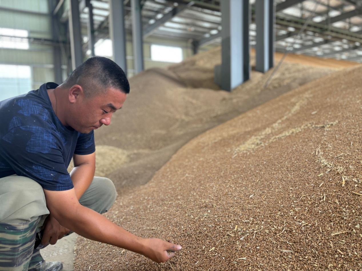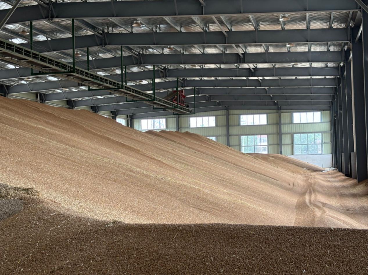 “走,一起去看看我的新地方!”坐上趙永菁停在田頭的面包車,穿過田野駛向大路,十來分鐘后到了一處嶄新的“大廠房”前,“罡楊西馮烘干中心”幾個紅色大字很是醒目。“今年3月份搬來的,面積2600平方米,我們一次性投入了8臺嶄新的烘干機。”趙永菁邊說邊按下遙控器打開卷簾門,一座碩大的“麥山”映入眼簾,頗為震撼。 農場今年新收的夏糧就在這座麥山里,加上周邊其他農場和散戶送來售賣的部分,這座大倉庫里擁有1700噸麥子。走進倉庫,烘干機整齊排列于靠墻的一邊,需要烘干的糧食由地坑直接推入,上吸到一個篩選機里,除去碎秸稈等廢料之后進入烘干機,烘干結束再由傳送帶直接傳送到倉庫中間堆積起來。“今年夏糧收割后正式啟用新設備,一天大概能烘完500畝地的麥子。”
