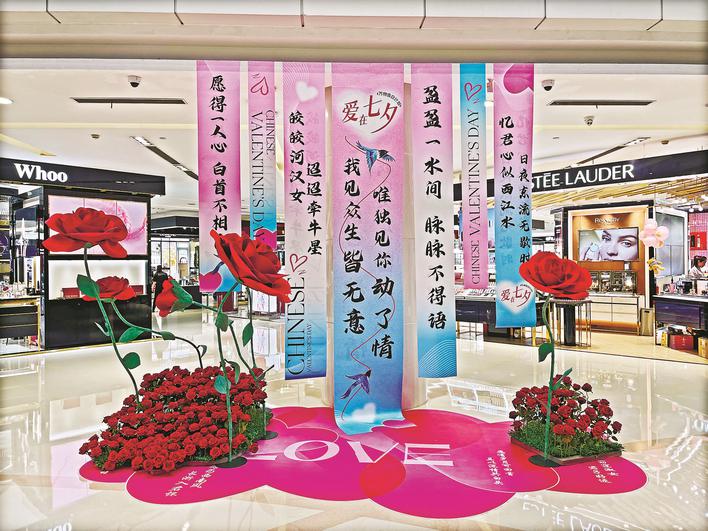 玫瑰瀑布、巨型花束、詩詞條幅……泰州市區大型商場、綜合體,紛紛推出形式多樣的七夕浪漫裝飾,以吸引情侶前往“打卡”,并推出打折、滿減、贈送等優惠活動。 8月7日,萬象城眾多品牌黃金珠寶品牌專柜,分別設有“黃金克減50元”“情侶對戒買一送一”“彩金飾品七夕特惠3.8折”等促銷展板。“手串、項鏈等首飾很受歡迎,比如足金琺瑯蝴蝶吊墜、小金珠等,價格只有三位數。”某金店銷售人員說,七夕前后是黃金消費小高峰,各家都會抓住機會。記者采訪時,市民湯先生看中一款耳環和一枚戒指,想七夕當天給妻子一個驚喜,“金飾設計越來越美,送人體面且保值。” 化妝品、巧克力也是主打禮物。不少商超美妝品牌推出七夕限定套盒優惠,熱門產品加入玫瑰、愛心等元素,寓意愛情甜蜜。巧克力禮盒買贈活動也比比皆是。 除購物和送禮,很多情侶會選擇共享浪漫晚餐過七夕。因此,不少西餐廳推出“七夕限定”套餐、雙人情侶套餐等。“今年七夕恰逢周六,預訂晚餐的肯定多。”泰州市區萬達廣場一位餐廳負責人說,屆時餐廳將為情侶們提供溫馨浪漫的用餐環境。