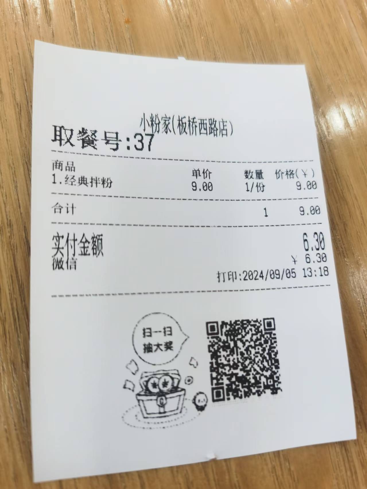 吃飯可以打折?記者半信半疑。 王曉偉照例點了一份經典拌粉,掏出手機支付。記者接過小票,上面寫著“單價9元,實付6.3元”,打了七折。吃飯間隙,陸續有騎手進來就餐。