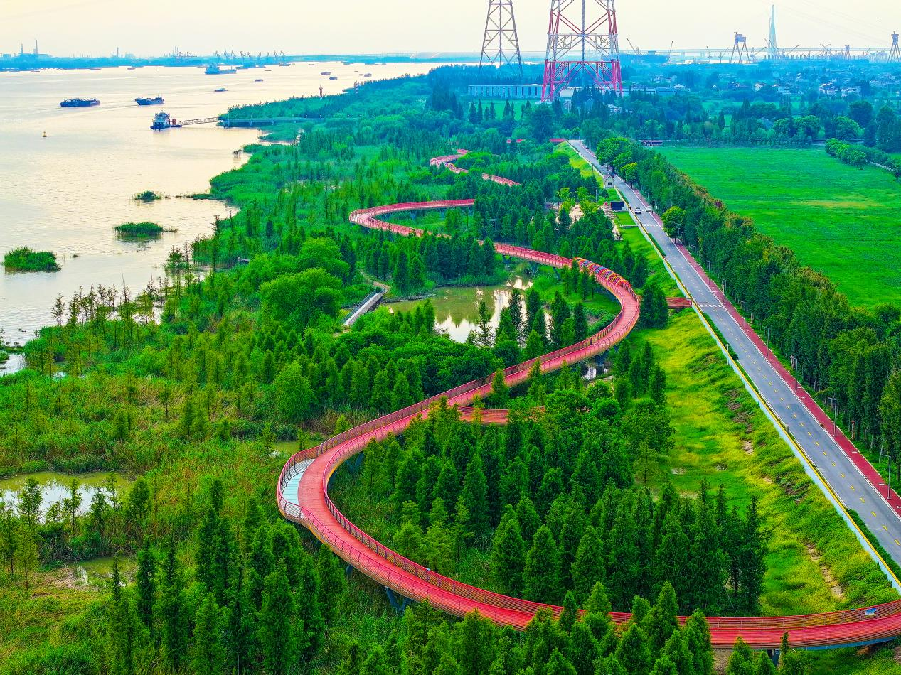 △母子豚。朱其攝 珍稀物種相繼出現 在靖江能隨意偶遇的珍稀物種,遠不止長江江豚。 近年來,靖江市秉持“生態優先、綠色發展”的理念,把修復長江生態環境擺在重要位置,通過長江禁漁、沿江碼頭治理、生態濕地公園建設等措施,加快構建“九港水美、百里岸綠”的生態格局。 2021年12月,長江國家文化公園建設啟動,靖江被劃為核心區。該市以涵養“百里最美江岸”統攬沿江生態修復和景觀提檔,相繼建成牧城生態園、大橋生態園、音樂花海廣場、東線第一帆公園、漁憶長江濕地公園等標志性工程,連片6.4公里、近4000畝的沿江綠色生態廊道,每年接待服務游客百萬人次以上。 夕陽西下,新橋鎮新合村的漁憶長江濕地生態公園綠意盎然,5年前,這里還分布著碼頭、工廠、魚塘。靖江市在全省范圍率先完成36個沿江岸線占用項目清理整治工作,累計清退沿江企業12家,騰退生產岸線7.1公里。通過岸線留白,原先江岸邊的“工業銹帶”已經蝶變為大江風光帶。 水質變好了,天空變藍了,越來越多的動物“做客”靖江、“戀上”靖江。 今年6月,靖江攝影愛好者王躍先在濱江新城拍攝到國家二級重點保護野生動物水雉。5月,在馬洲島上,觀測團隊觀測到極危(CR)物種黃胸鹀。2月,23只“鳥中國寶”東方白鸛出現在馬洲島濕地,這一珍稀瀕危物種在全球僅存數千只。 一城“護漁”人 長江小橋港段,編號“蘇靖護魚31902”的護漁船正在巡邏。駕船的于興國原是漁民,長江禁捕后,響應號召,成為一名護漁員。 2019年,靖江市打響長江禁捕退捕攻堅戰,幫助上岸漁民轉產就業。當年底,全市1031艘漁船、4983名漁業人口全部上岸。長江靖江段比全國大多數地區提前一年完成全面禁捕。
