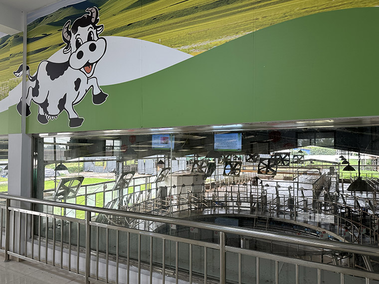 小楊社區(qū)黨委書記王政說,這里原是幾條廢棄河溝和荒地,2022年開始復(fù)墾整治,村集體投入200萬元、企業(yè)配套100萬元,村企共同打造“菇菇部落”項目,游客在科普、生產(chǎn)、制作、游玩四個區(qū)域,可以享受看菇、聽菇、玩菇、吃菇、購菇“一條龍”體驗。該項目還被評為省中小學(xué)生勞動教育與綜合實踐優(yōu)秀基地。 今年,“菇菇部落”升級了菌棒制作區(qū)和田間課堂,優(yōu)化科普研學(xué)、休閑觀光、農(nóng)耕體驗等新功能,自2022年9月建成后,累計開展研學(xué)活動100多場次,接待學(xué)生2萬多人次。 奶牛場打造“探鮮奶吧” “從這里可以看到奶牛場制奶全過程,甚至聞到奶味清香。”10月24日,在姜堰區(qū)大倫鎮(zhèn)土山村奶牛場內(nèi),土山村村委會副主任施冬梅介紹奶牛場研學(xué)基地改造情況。