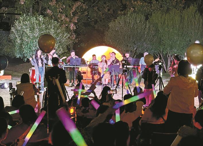臺上,年輕的歌手和樂手盡展才華;臺下,座無虛席,既有遠道而來的樂迷,也有散步路過的附近居民。大家或手舞熒光棒,跟著音樂一起歌唱,或手持手機,記錄下精彩瞬間,充分享受音樂帶來的松弛感。“沒想到在家門口也能欣賞到音樂會,氛圍很嗨,超級治愈!”00后上班族小于說。