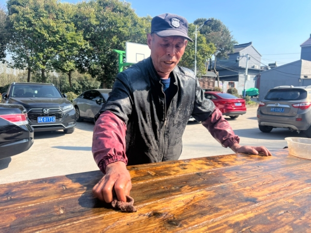 作為會船節籌備中最具儀式感的環節,桐油涂刷不僅是防水防腐的關鍵工序,更承載著水鄉人家“船承人”樸素的熱愛。記者在河畔觀察到,75歲的老匠人田長洪正手持棕刷,將金黃的桐油細細涂抹在木船上。他告訴記者:“刷桐油很有講究,需要遵循古法,將生桐油與熟桐油按秘方配比,在晴好天氣分七輪涂刷,刷足七七四十九道,滲進木頭紋理才管用,讓船體形成琥珀色的保護膜,用傳承百年的傳統工藝為這場‘水上廟會’注入靈魂。”