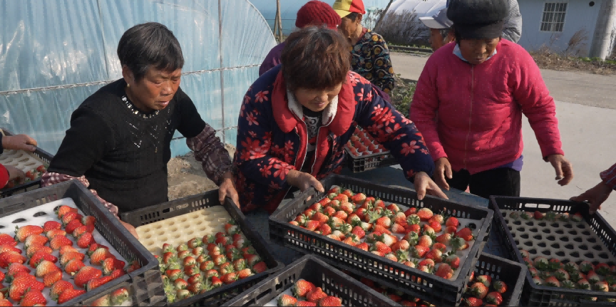 許莊村1600畝草莓種植基地堪稱典范。這里集草莓全鏈條生態種植、深度加工、鄉村旅游于一體,是“同心共富”引領帶動的核心陣地。過去一年,草莓銷售產值突破1.5 億元,增幅達30%,線上銷售500萬元,帶動8個村集體經營性收入邁過百萬大關;貏撧k人王劍鋒介紹:“借助與鑫榮懋果業科技集團等龍頭企業深度合作,我們讓老區草莓走進大型商超,拓寬了市場半徑。” 不僅如此,基地還與省農科院“聯姻”,設立“亞夫工作站”,推廣高壟種植等新技術。智慧化大棚里,紅顏、寧玉等新品種草莓在春節期間搶“鮮”上市,贏得市場青睞。種植戶許彬滿臉幸福:“智能大棚讓畝產量從2500斤躍升至3500斤,畝銷售額達6萬元,是普通大棚兩倍。” 如今,蔣垛鎮已創建10多家田頭“同心共富”夢工廠,吸納就業近600人,人均年增收超3.5萬元。