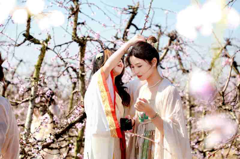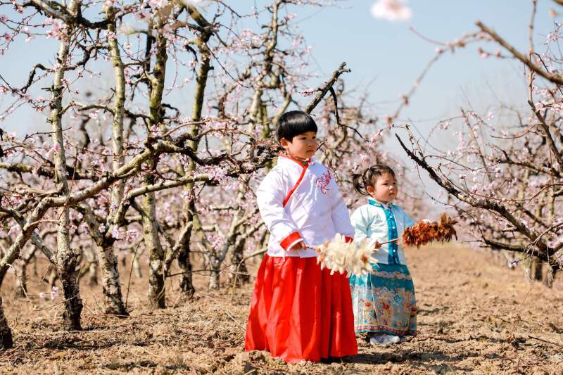 桃園里朵朵桃花陸續(xù)綻放,或正、或側(cè)、或仰、或俯,紅白相間,婀娜多姿。枝頭有一些慵懶的,仍含苞待放,猶如美人額間胭脂色的花鈿。放眼望去,桃樹(shù)綿延,桃花爛漫,美不勝收。游客們穿梭于桃林之間,紛紛舉起手機(jī),記錄下這美好時(shí)刻。