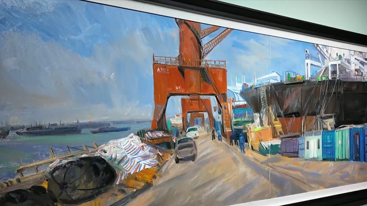 走進展覽,中國美術家協會主席范迪安創作的4米巨幅油畫《面向世界——新揚子造船之景》率先映入眼簾,磅礴的工業美學形成新的江岸風光,敘寫泰州“大海新晨”壯麗篇章。 “枝葉關情詩書畫名家采風活動作品展以“一人三作”的獨特展陳方式,系統呈現了三十余位藝術名家筆下的泰州意象。 泰州美術館副館長、泰州市美術家協副主席兼秘書長梅德君說:“藝術家們用了4天時間,創作了不少作品,我們從中選了一些他們認為是比較好的作品。” 泰州市永安洲小學學生祝恬說:“從實地的景色,到紙上的風光,是兩種完全不同的味道,這些作品給我們帶來了全新的感受視角。”