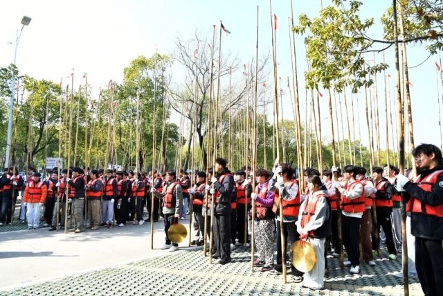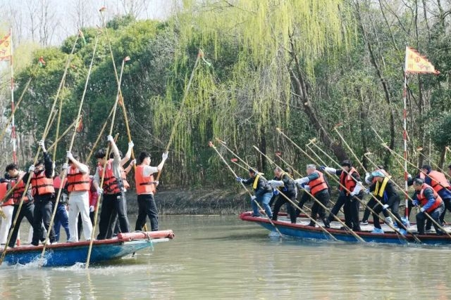 據悉,本次會船比賽共有230多支參賽隊伍。值得一提的是,其中還邀請了7所高校的8支隊伍參加。隨著鏗鏘鼓點響起,大學生們齊聲發力,下篙、撐水、起篙一氣呵成,長篙入水濺起層層水花,船身平穩行進。從最初的手忙腳亂、節奏不一,到動作整齊、配合默契,這群年輕學子用汗水完成了從“書生”到“篙手”的蛻變。 “篙船講究心往一處想、勁往一處使,一人失誤就會影響整條船。我們不僅要練熟動作,更要把會船精神傳遞給新隊友。”來自南師大泰州學院的王鈺淇是第二次參加訓練。訓練中,她主動分享經驗給新手。而同樣來自該校的王飛則是第一次參加訓練。“經過一上午的訓練,雖然不是很熟練,但是在教練和王鈺淇的指導下,也能跟著鼓點劃篙,看著船兒平穩前行,特別有成就感。這不僅是體能鍛煉,更讓我感受到非遺文化的魅力。”王飛的眼里滿是堅定。