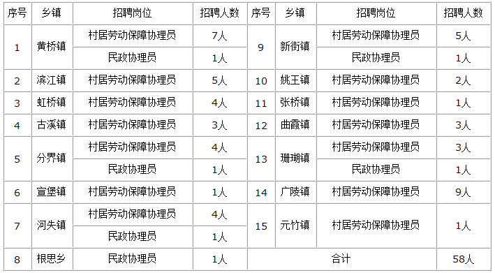 為進一步加強基層公共服務平臺建設,充實人社基層平臺服務隊伍,根據《關于進一步加強人力資源和社會保障基層公共服務平臺建設實施意見的通知》(泰政辦發〔2014〕108號)等文件精神,決定面向社會公開招聘基層公共服務公益性崗位工作人員58名,其中村居勞動保障協理員52名、民政協理員6名,現就有關招聘事項公布如下: