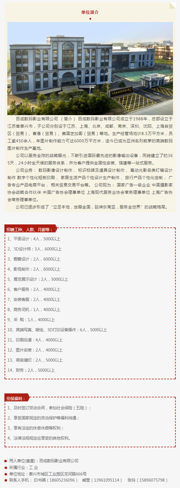百成數碼影業有限公司、江蘇博門藝嘉網絡技術有限公司、意飄達傳媒科技有限公司2019招聘簡章