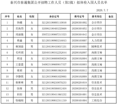 附件:2020年泰興市泰通集團(tuán)公開招聘人員體檢名單