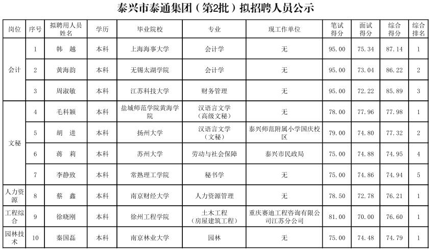 泰興市泰通集團(第2批)擬招聘人員公示表