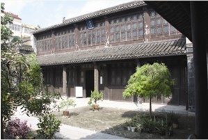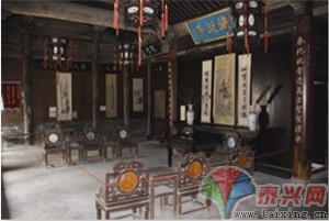 進大門過小天井則是儀門,儀門體現(xiàn)了明代建筑簡潔明快、線條流暢的風格。儀門門樓系磨磚砌筑,采用民間糯米汁和石灰漿粘接,灰縫細密結實,至今嚴絲合縫。儀門向內(nèi),豁然開朗,穿過大天井,便是古意盎然的大廳。大廳面寬三間,南立面檐柱與廳堂之間設走馬廊檐以擴張廳堂空間進深。走馬廊梁柱獨具匠心,采用荷葉形木墩作點綴,8個墩體12個外立面無一雷同。大廳為木結構建筑,用料精良,工藝考究,廳堂木樁為金絲楠木。廳堂構架粗壯氣派,正梁下的云柱柱頭與承梁斗拱之間采取了透雕“抱梁云”、“山霧云”花板予以配飾,榫卯結合,相得益彰。當年廳堂梁、枋、柱頭、斗拱等構件上均以彩繪裝飾,至今仍依稀可見梁架上山水花鳥殘留痕跡。地面以一尺見方的磚材鋪設。大廳向后乃一大院,原建有何氏族人題名的振裔樓,后毀于火災,1992年由地方政府出資在原址重建,現(xiàn)作為陳列歷史文物的展廳。