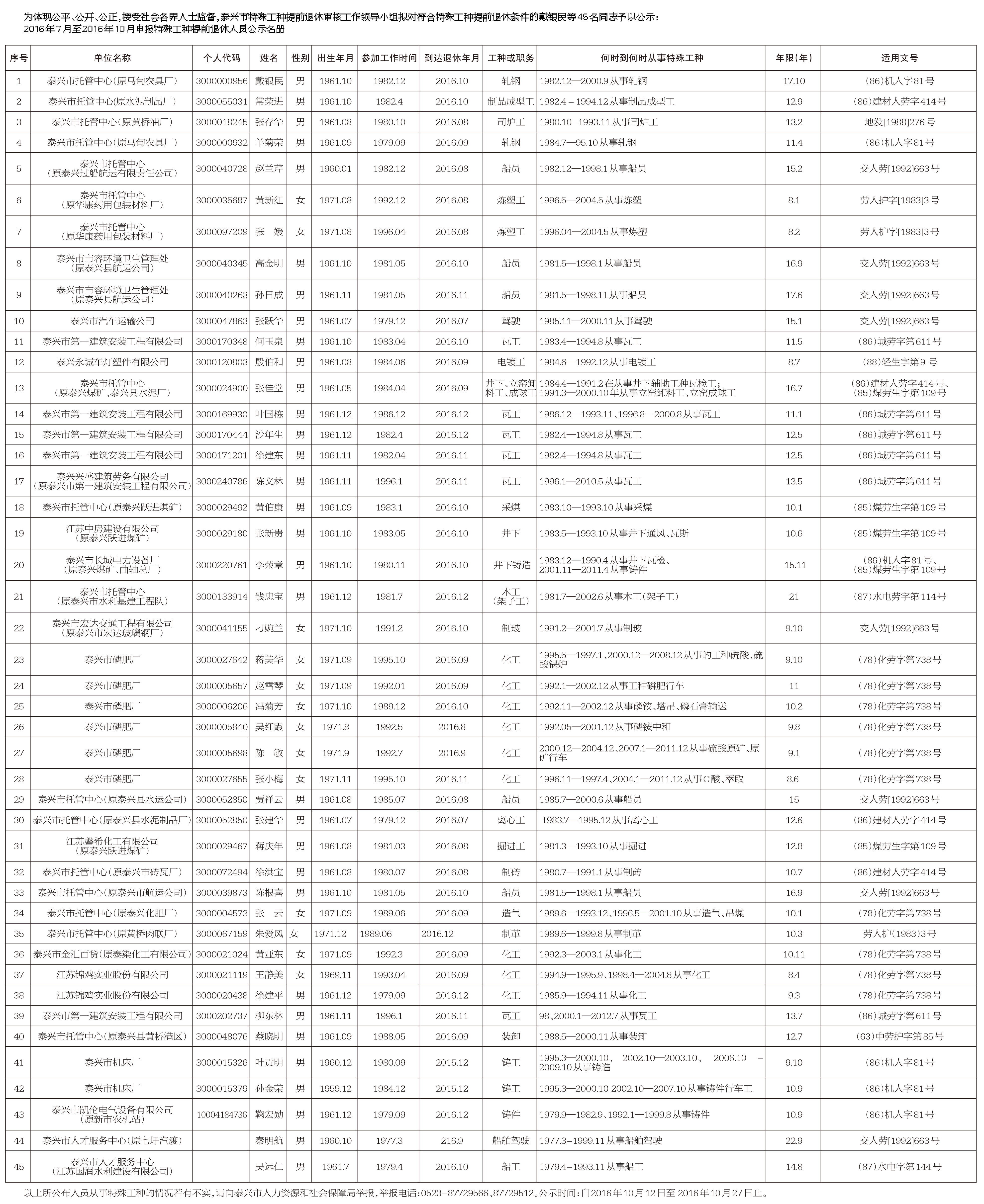 泰興市企事業(yè)單位從事特殊工種提前退休人員公示表
