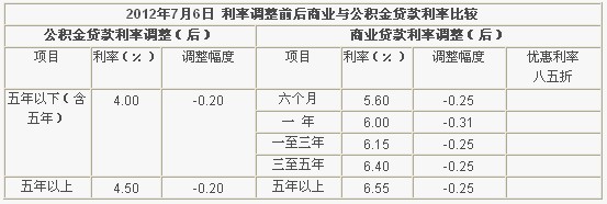 2012年7月6日利率調整前后商業與公積金貸款利率比較