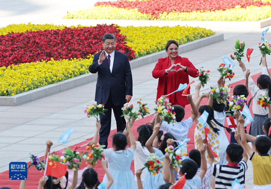 6月12日下午,國家主席習近平在北京人民大會堂同來華進行國事訪問的洪都拉斯總統卡斯特羅舉行會談。這是會談前,習近平在人民大會堂東門外廣場為卡斯特羅舉行歡迎儀式。新華社記者 劉彬 攝