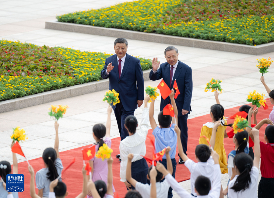 8月19日,中共中央總書記、國家主席習近平在北京人民大會堂同來華進行國事訪問的越共中央總書記、國家主席蘇林舉行會談。這是會談前,習近平在人民大會堂東門外廣場為蘇林舉行歡迎儀式。新華社記者 翟健嵐 攝 蘇林抵達時,禮兵列隊致敬。習近平同蘇林登上檢閱臺,軍樂團奏中越兩國國歌,天安門廣場鳴放21響禮炮。蘇林在習近平陪同下檢閱中國人民解放軍儀仗隊,并觀看分列式。 當天中午,習近平和彭麗媛在人民大會堂金色大廳為蘇林夫婦舉行歡迎宴會。 蔡奇、王毅、王小洪等參加上述活動。 蘇林訪華期間,雙方將發表《中華人民共和國和越南社會主義共和國關于進一步加強全面戰略合作伙伴關系、推進中越命運共同體建設的聯合聲明》。 |