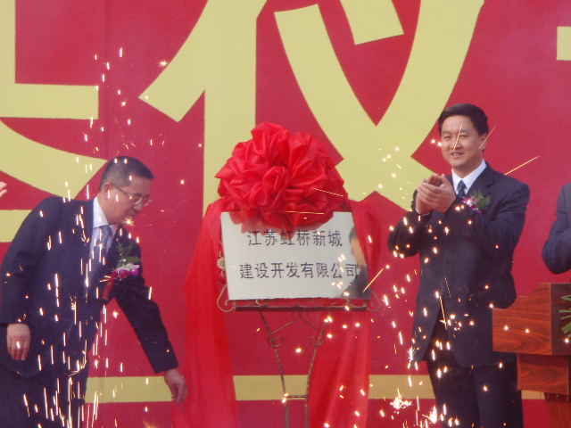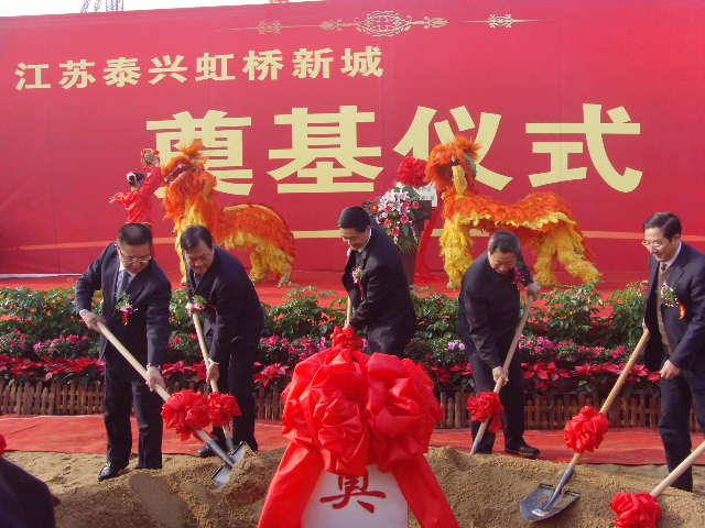 泰興市領導張兆江、高亞梓、張澤民、劉榮華、田之本、張偉、姜文湘、朱從云和投資建設方代表出席了奠基儀式,并為虹橋新城項目開工奠基。泰興市委書記、市人大常委會主任張兆江和香港凱旭集團總裁胡斌為江蘇虹橋新城建設開發(fā)有限公司揭牌。泰興市委常委、副市長、虹橋工業(yè)園區(qū)黨工委書記、管委會主任劉榮華主持了奠基儀式。 虹橋新城項目于 泰興市委副書記、市長高亞梓在奠基儀式上指出,虹橋新城項目是江蘇省虹橋工業(yè)園區(qū)積極落實市委、市政府打造泰興“一體兩翼”新格局的重大戰(zhàn)略部署,創(chuàng)新發(fā)展思路,運用市場化機制,成功引進的重大基礎設施項目,也是全市的一項重大工程。新城項目的開工建設,預示著園區(qū)的基礎設施建設進入全面加速期,將有力提升園區(qū)整體形象,加快推進我市“學趕蘇南、跨越發(fā)展”進程。高亞梓希望合作各方密切協(xié)作,高起點、高標準實施項目建設,努力打造一座生態(tài)、宜居、樂活的濱江新城,并要求虹橋工業(yè)園區(qū)和相關部門把新城建設作為市委、市政府的重點工程,主動服務、創(chuàng)新服務、高效服務、優(yōu)質服務,為新城建設開辟綠色通道,提供一切便利條件,推動虹橋新城項目快建設、早見效。