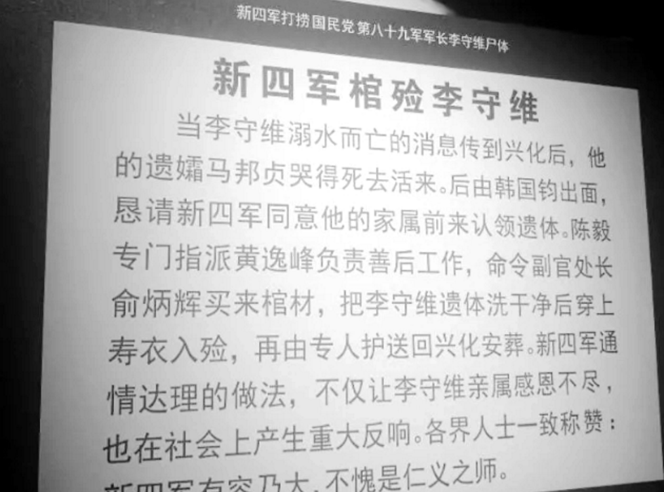 黃橋決戰打響后,新四軍駐黃橋7000將士,在陳毅親自指揮之下,浴血抗擊來犯的李守維部,戰斗持續進行了3天3夜。眼見自己的部隊節節潰敗,李守維從斷后的督軍,變成了潰逃的尖兵,急切之中,他穿上士兵的衣服從姜黃公路逃命而去,途中,失足跌入河中淹死。這樣一個人可以說是死有余辜,陳毅為什么還要棺殮他呢?