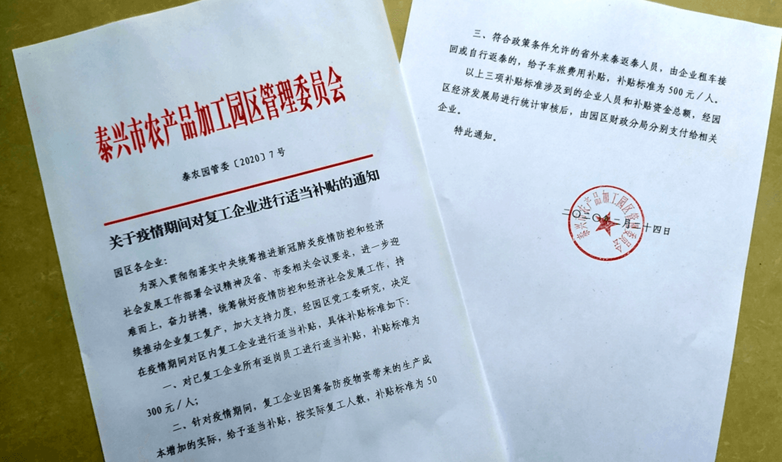 注入資金活水,促進企業(yè)復(fù)工達(dá)產(chǎn) 復(fù)工復(fù)產(chǎn),資金是源頭活水。2月24日,泰興市農(nóng)產(chǎn)品加工園區(qū)出臺文件,對35家生產(chǎn)性企業(yè)發(fā)放穩(wěn)崗復(fù)產(chǎn)補貼,對所有返崗員工每人300元補貼企業(yè);因籌備防疫物資帶來的生產(chǎn)成本,按實際復(fù)工人數(shù)每人50元補貼企業(yè);對省外來泰返泰人員,由企業(yè)租車接回或自行返泰的,給予車旅費用補貼,每人500元補貼企業(yè),園區(qū)累計已發(fā)放企業(yè)復(fù)工復(fù)產(chǎn)補助126萬元。“不僅補貼,郵政儲蓄銀行1000萬貸款,園區(qū)也協(xié)助轉(zhuǎn)貸,利息補貼20萬左右。”朱敏說,這些政策確保了企業(yè)140多名員工到崗復(fù)產(chǎn)。“今年一季度,園區(qū)幫助企業(yè)協(xié)調(diào)無本轉(zhuǎn)貸1.5億元,幫助江康藥業(yè),新源倉儲等企業(yè)新增貸款1.9億元。有效緩解了企業(yè)發(fā)展資金壓力,提升了企業(yè)發(fā)展信心。”泰興市農(nóng)產(chǎn)品加工園區(qū)管委會副主任杜建彬表示。