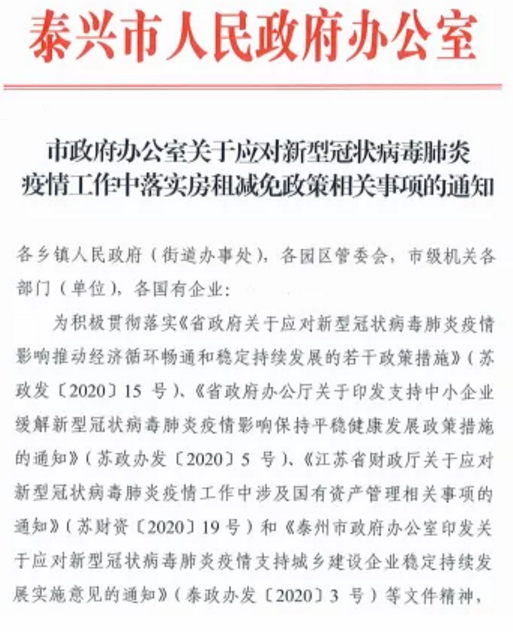 突如其來的新冠肺炎疫情讓一些中小企業陷入了困境,為切實減輕疫情對中小企業生產經營的影響,江蘇省泰興市出臺《關于應對新型冠狀病毒肺炎疫情工作中落實房租減免政策相關事項的通知》,明確對承租市級機關事業單位、鄉鎮(園區)、各國有企業(國有獨資、全資、國有控股)國有資產類經營用房的中小微企業和個體工商進行租金減免
