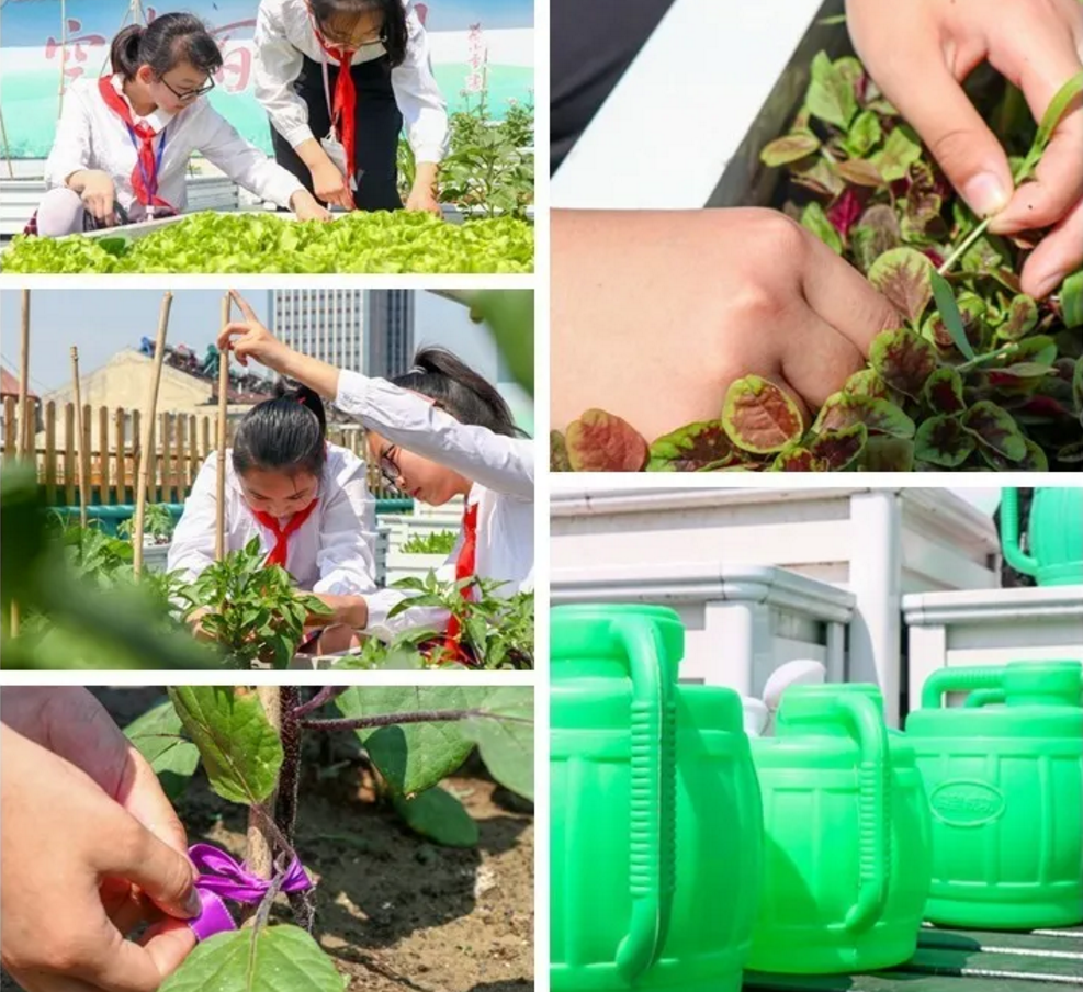 “不必說碧綠的菜畦,光滑的石井欄,高大的皂莢樹,紫紅的桑葚;也不必說鳴蟬在樹葉里長吟,肥胖的黃蜂伏在菜花上,輕捷的叫天子(云雀)忽然從草間直竄向云霄里去了……何首烏藤和木蓮藤纏絡著,木蓮有蓮房一般的果實,何首烏有擁腫的根。”——魯迅《從百草園到三味書屋》風景優美、植物繁茂,還有各種可愛的小動物,這是魯迅先生筆下的百草園。這里裝著他兒時關于植物、關于草木的溫暖記憶。這里是他的童年樂園,也是他對家的懷念。 當微風拂過,紅的、綠的、黃的,各種植物迎風招展,在陽光照耀下,茁壯成長。這是哪兒?定睛一看,這不是孩子們的“空中百草園”嘛。