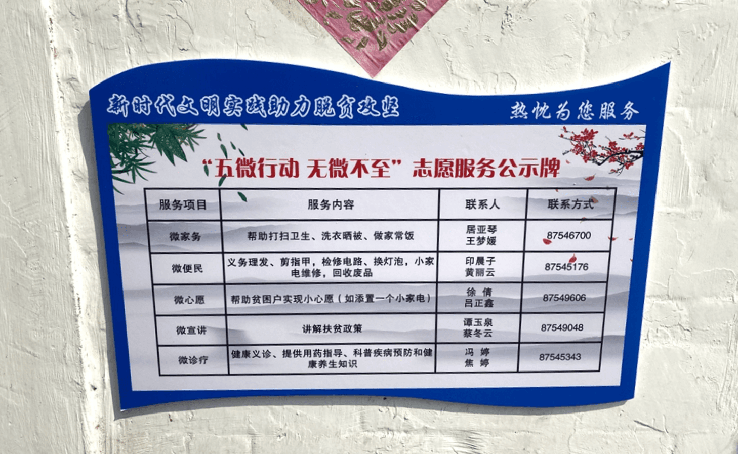 微家務:“小時工”在線接單 脫貧攻堅不止要扶貧,也要“撫”心。“多謝黨和政府對我們這些老人的關心,平時都是一個人,今天心里真是說不出的感動。”葉文英平時一個人在家,缺少交流對象,志愿者為老人燒飯打掃,一起吃飯,讓溫暖與愛凝聚,把弘揚孝老敬老融入到脫貧攻堅。姚王鎮黨委關注貧困戶的精神需求,聚焦孤寡老人的生活層面,以“微家務”的形式為特殊人群做一頓家常飯、話一次家常、打掃一次衛生、洗一次碗筷,以真心的陪伴送去溫暖與關愛。 微便民:“管家”面面俱到 在常態化的貧困戶走訪活動中,姚王鎮黨委發覺有的建檔立卡戶出門不易,給日常生活造成了不便。對此,“五微行動”建立健全便民服務體系,以姚王鎮團委的青年志愿服務隊為主,建立起相對應的資源庫。將志愿服務隊負責人的名單公示,張貼至全村所有建檔立卡低收入戶入戶醒目處,由村(居)新時代文明實踐站統一派單,各志愿服務隊隨時接單,常態化開展貼近群眾生活需要的志愿服務。