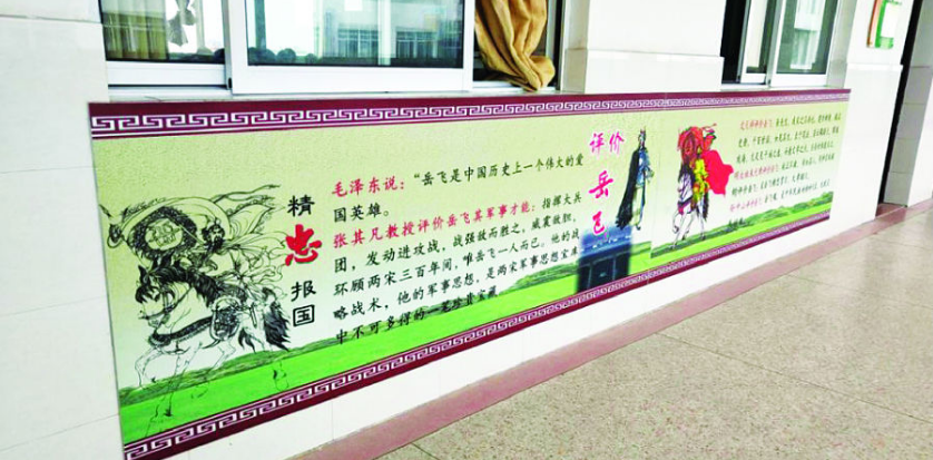 打造“岳飛魂”特色文化基地 通過物化,讓墻壁、教室、雕塑、長廊建設(shè)布置,將“岳飛魂”活靈活現(xiàn)、翔實(shí)可信地讓岳飛故事耳熟能詳,讓岳飛形象躍然眼前,讓岳飛精神撲面而來。學(xué)校精心構(gòu)思,推進(jìn)“四個(gè)一”環(huán)境建設(shè)。