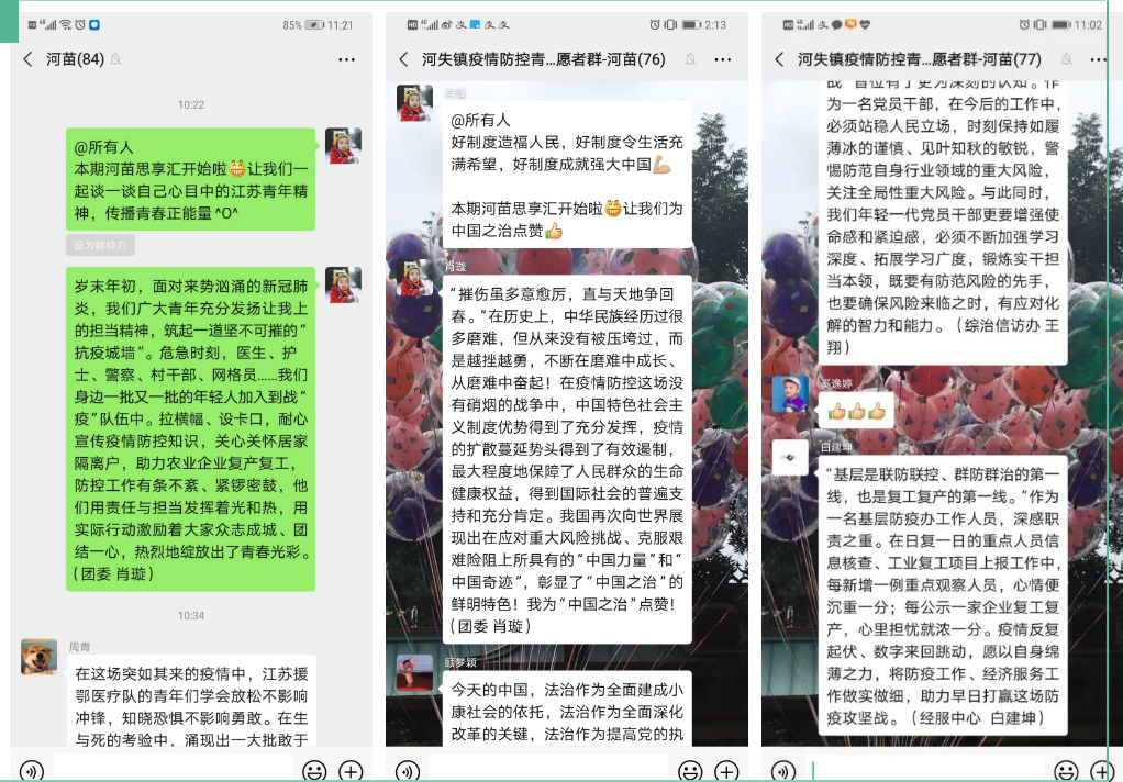 依托“河苗驛站”陣地,積極打造“河苗思享匯”交流服務平臺,線上線下“雙線”發(fā)力,建立起青年互相碰撞思想火花的平臺,用青春力量破解部分基層治理中的難點。線上集中學習交流,建立“河苗”微信群,圍繞“聚精-思享·信仰”“聚論-思享·術業(yè)”“聚議-思享·漫談”三大板塊,每期討論交流不同主題內容,推動黨的創(chuàng)新理論及新思想入耳入心;成立“河苗青年說”線上宣講隊,積極探索創(chuàng)新理論宣講模式,通過凝聚青年力量,向村民及時傳遞黨的聲音,傳遞正能量。線下志愿服務行動,發(fā)揮全鎮(zhèn)青年黨團員先鋒模范作用,組織“河苗青年志愿者服務隊”多渠道多形式開展各類主題宣傳、志愿服務,鼓勵、引導新興青年加入,切實把“機關+村+企業(yè)”青年的智慧和力量凝聚到服務本鎮(zhèn)發(fā)展上,打響基層治理志愿服務品牌。
