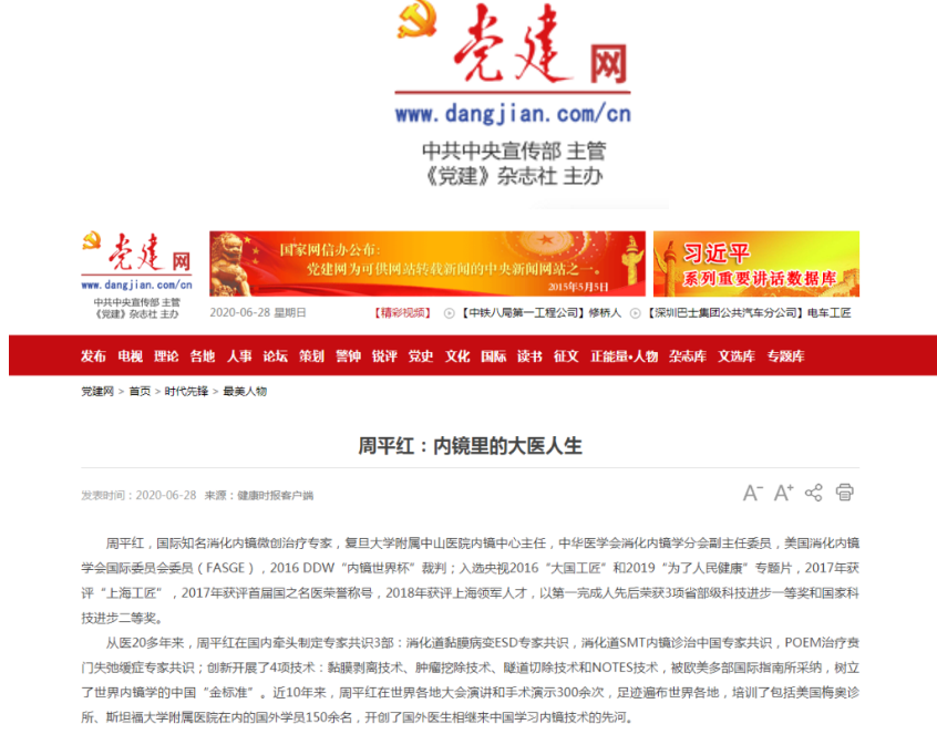 周平紅,國際知名消化內(nèi)鏡微創(chuàng)治療專家,復(fù)旦大學(xué)附屬中山醫(yī)院內(nèi)鏡中心主任,中華醫(yī)學(xué)會消化內(nèi)鏡學(xué)分會副主任委員,美國消化內(nèi)鏡學(xué)會國際委員會委員(FASGE),2016 DDW“內(nèi)鏡世界杯”裁判;入選央視2016“大國工匠”和2019“為了人民健康”專題片,2017年獲評“上海工匠”,2017年獲評首屆國之名醫(yī)榮譽稱號,2018年獲評上海領(lǐng)軍人才,以第一完成人先后榮獲3項省部級科技進步一等獎和國家科技進步二等獎。從醫(yī)20多年來,周平紅在國內(nèi)牽頭制定專家共識3部:消化道黏膜病變ESD專家共識,消化道SMT內(nèi)鏡診治中國專家共識,POEM治療賁門失弛緩癥專家共識;創(chuàng)新開展了4項技術(shù):黏膜剝離技術(shù)、腫瘤挖除技術(shù)、隧道切除技術(shù)和NOTES技術(shù),被歐美多部國際指南所采納,樹立了世界內(nèi)鏡學(xué)的中國“金標(biāo)準(zhǔn)”。近10年來,周平紅在世界各地大會演講和手術(shù)演示300余次,足跡遍布世界各地,培訓(xùn)了包括美國梅奧診所、斯坦福大學(xué)附屬醫(yī)院在內(nèi)的國外學(xué)員150余名,開創(chuàng)了國外醫(yī)生相繼來中國學(xué)習(xí)內(nèi)鏡技術(shù)的先河。