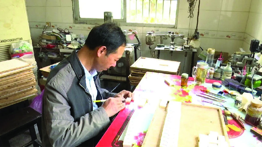 ●泰興麻將雕刻● 麻將雕刻工藝自二十世紀三十年代初,從香港、蘇州雕刻工藝品廠傳入。由一開始單純的竹片雕刻發展到水牛骨、絲竹、亞克力、牛角、紅木等高檔雕刻。麻將又稱雀牌,是雕刻工藝品,工藝流程較為復雜,凡人物肖像、萬壽圖等特殊工藝品必須手工雕刻,造型、作色復雜,制作時間長,要求字、畫清晰,表面光滑,肖像造型逼真,活靈活現,是機械雕刻所不能替代的絕妙工藝。所有工藝必須通過鋸、削、鉆、磨、刨、滾等工序,從粗到細達到精的生產過程。 劉軍是泰興張橋麻將工藝精品傳承骨干之一,二十多年來,一直從事《三國演義》、《水滸傳》、《紅樓夢》、《西游記》人物肖像雕刻,從未間斷。