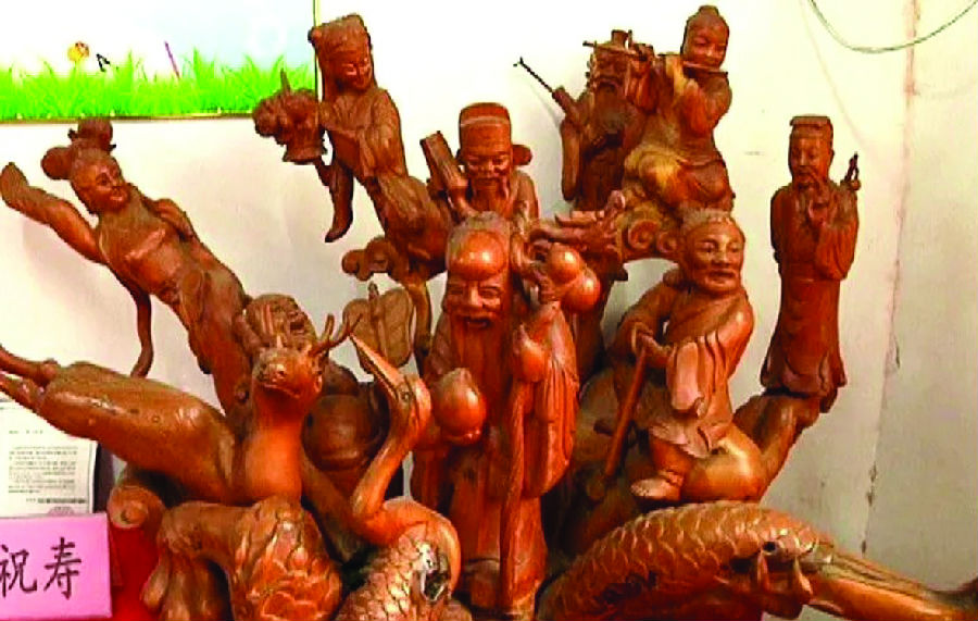 ●泰興銀杏木雕● 根雕藝術起源于唐朝,多見于寺廟、明清盛行。選購適合的銀杏樹根,去皮后置水浸數月,撈出陰干,根據造型構思。經精細圓雕、鏤雕、拼雕等多種手法加以創作,成形后打磨、刨光、上漆或打蠟。根雕的題材,多為吉祥如意、宗教信仰內容,主要用于室內裝飾和收藏等。