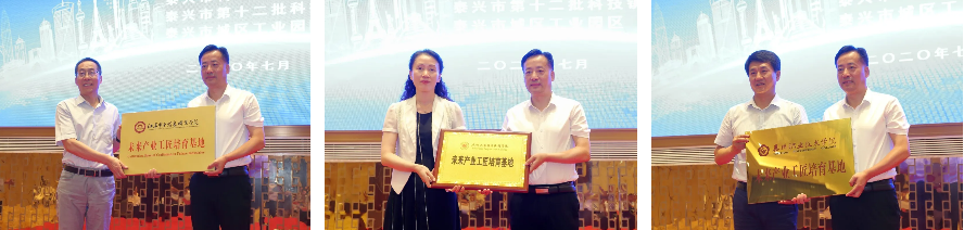 江蘇電子信息職業(yè)學(xué)院、鹽城工業(yè)職業(yè)技術(shù)學(xué)院、泰州職業(yè)技術(shù)學(xué)院分別與泰興市城區(qū)工業(yè)園區(qū)簽訂校地合作協(xié)議,并為城區(qū)工業(yè)園區(qū)授牌成立未來產(chǎn)業(yè)工匠培育基地。