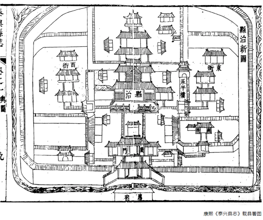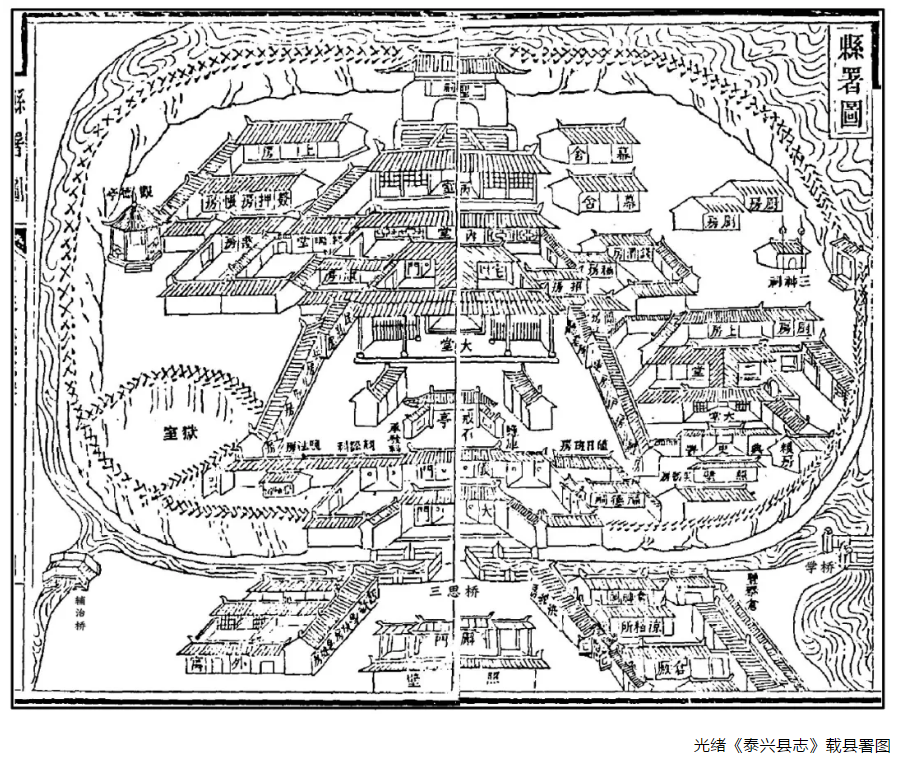 泰興縣治自南宋初由柴墟遷至延令,遂建縣衙,又稱縣署,后歷朝歷代多次修建增廣,至光緒年間縣衙的規(guī)模形制基本確定,機(jī)構(gòu)功能一應(yīng)完善齊備。