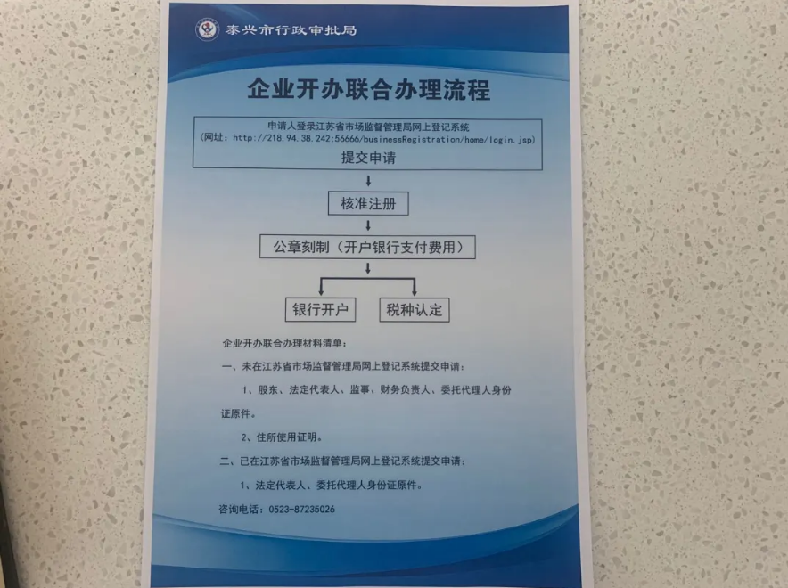 企業開辦專區整合集中了涉及相關部門的企業設立登記、印章刻制、銀行開戶、稅種認定等開辦企業的四個環節,并且提供免費代辦、免費刻章、免費銀行開戶“三免費”服務。泰興市行政審批局市場準入科副科長高巖介紹:“我們將四個環節整合一起,實行一窗受理集成服務,所有環節從兩個工作日縮短到0.5個工作日。”