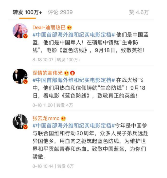 電影定檔之初,楊冪、迪麗熱巴、高偉光等人集體為《藍色防線》打call,向影迷安利這部戰地紀實電影。