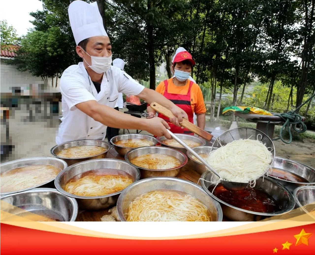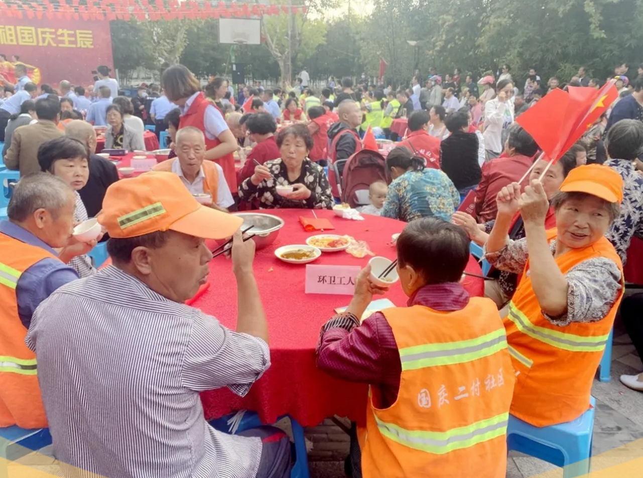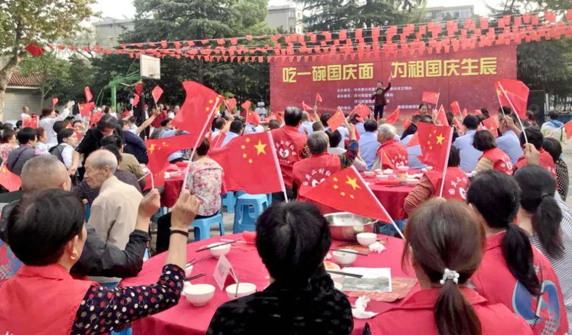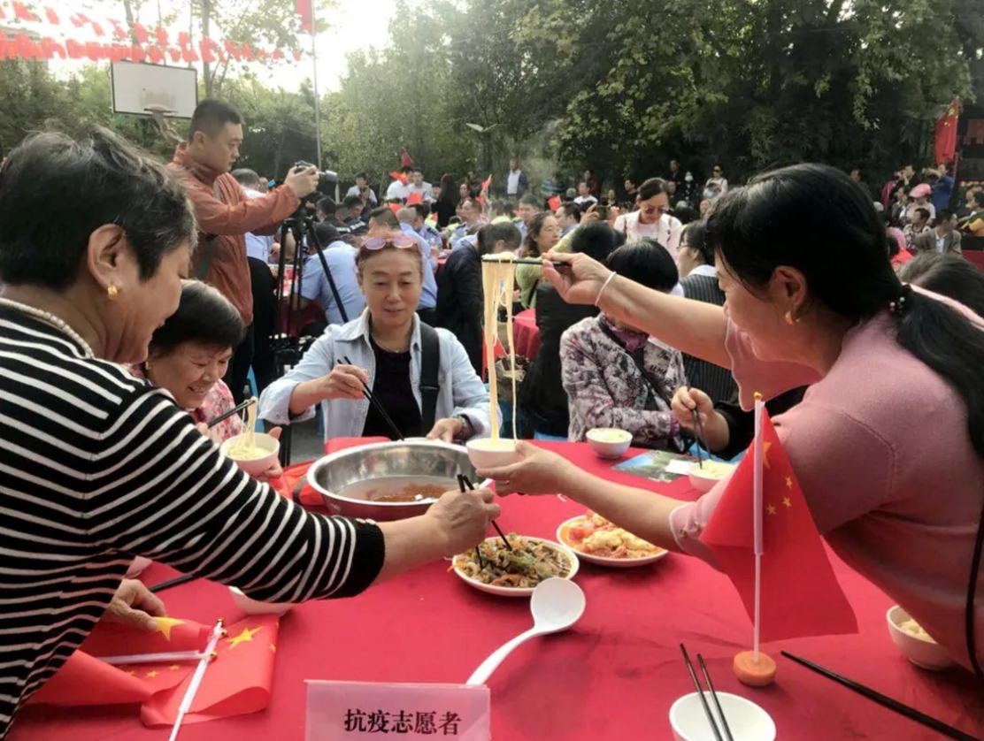 在中華人民共和國成立71周年之際,泰興市委宣傳部、文明辦、濟川街道、國慶二村社區、邀請市民同吃一碗“國慶面”。社區居民、醫護人員、人民教師、退伍軍人、環衛工人、抗疫志愿者……來自各行各業的400多人,歡聚一堂,用同吃“一碗面”,這一最生活化的表達方式,為祖國母親慶祝生日。