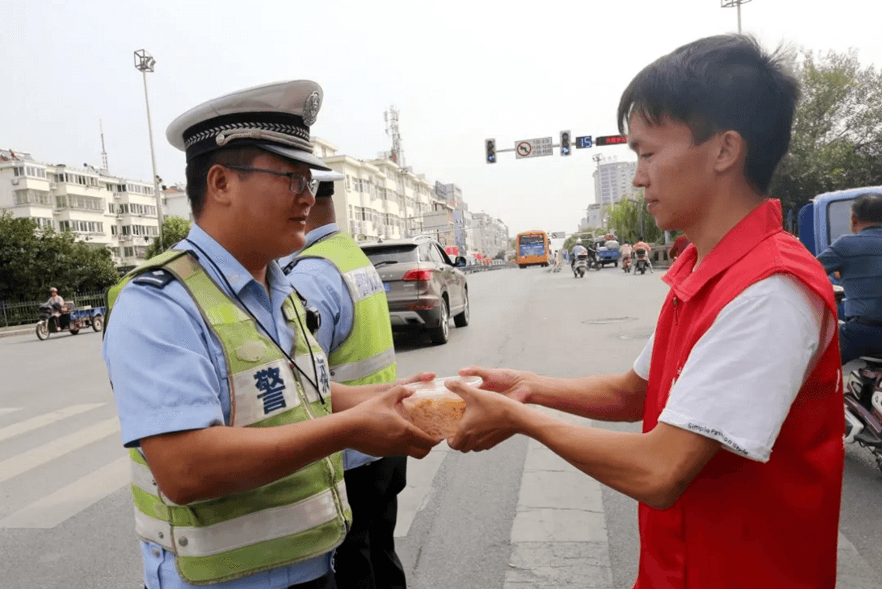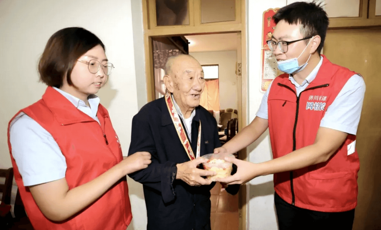 除了現場吃“團圓面”,社區志愿者們,將“長壽面”送到抗戰老兵家中,將“奮進面”送給執勤交警,以表達敬意,共迎國慶。