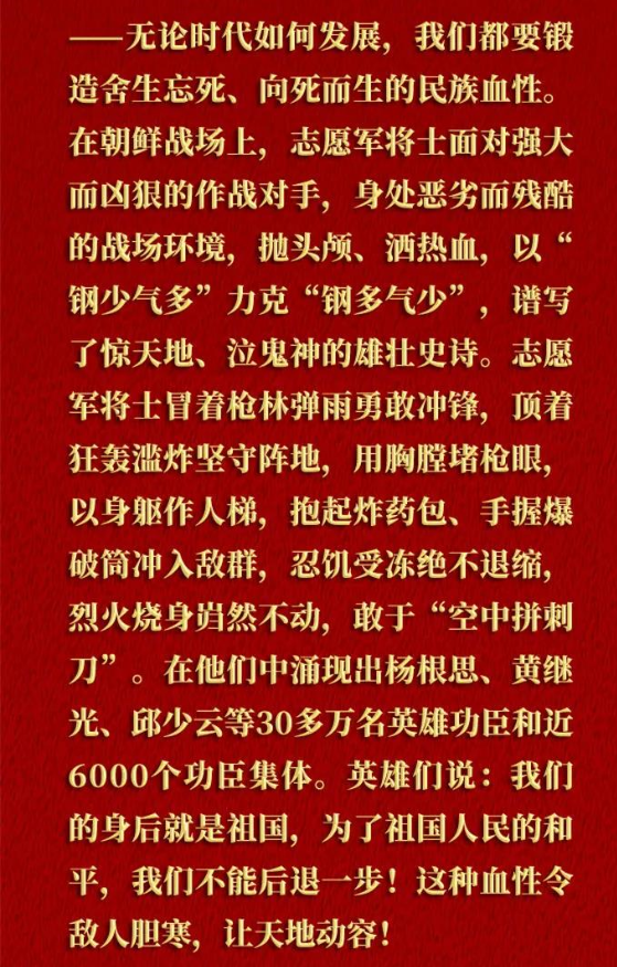 上午10點(diǎn),紀(jì)念中國人民志愿軍抗美援朝出國作戰(zhàn)70周年大會在北京人民大會堂隆重舉行,習(xí)近平總書記出席大會并發(fā)表重要講話。在講到“鍛造舍生忘死、向死而生的民族血性”時,習(xí)近平總書記說:志愿軍將士中涌現(xiàn)出楊根思、黃繼光、邱少云等30多萬名英雄功臣和近6000個功臣集體。