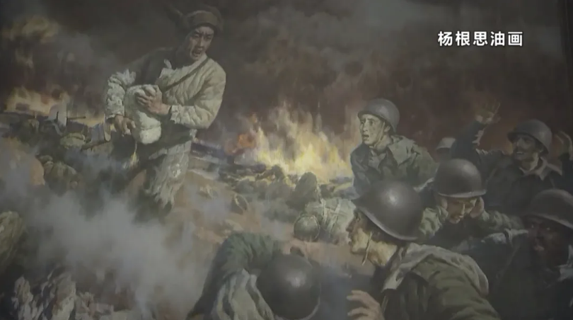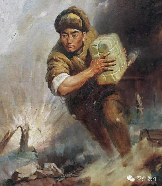 大批敵人已快要涌上山頭,楊根思抱著炸藥包,踏著美陸戰(zhàn)一師的軍旗,沖入敵群。一聲巨響,敵人粉身變泥土,英雄輝煌化金星! |